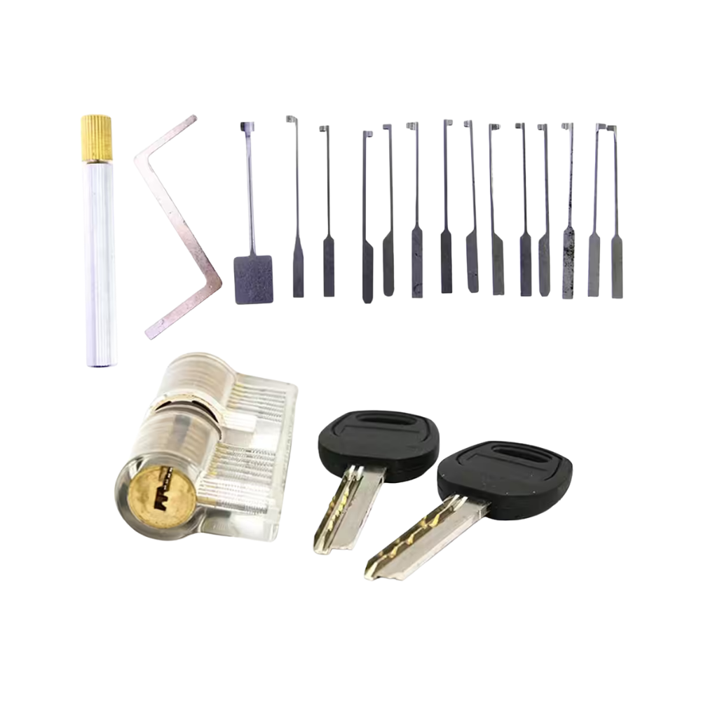 Transparant oefenslot (dimple-stijl): Dit is je belangrijkste leermiddel. Door de doorzichtige behuizing zie je exact hoe de pinnen reageren op je pick en wanneer ze op de breeklijn (shear line) vallen. Dit visuele aspect versnelt het leerproces van dit type veiligheidsslot aanzienlijk.